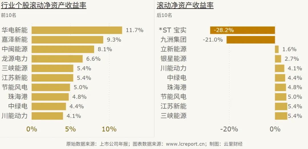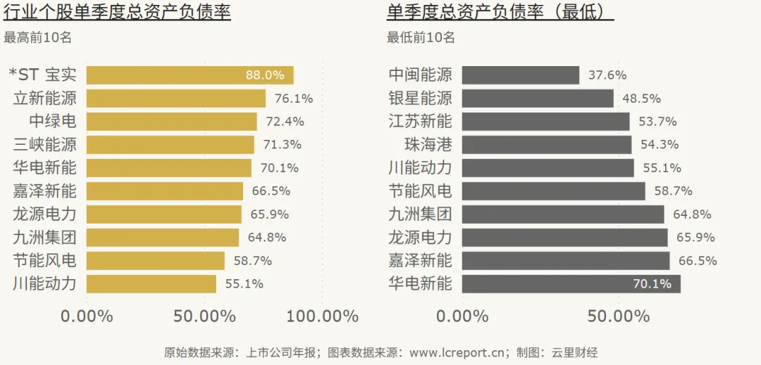 当季,风电业中滚动净资产收益率最高的个股是华电新能(600930),滚动净资产收益率为11.70 %;滚动净资产收益率最小的个股是*ST 宝实(000595),滚动净资产收益率为-28.17 %。个股资产盈利效率分化悬殊,部分标的资产运营效率高,能有效实现资产的保值增值,而部分标的资产利用效率低下,甚至出现资产减值,资产质量堪忧。