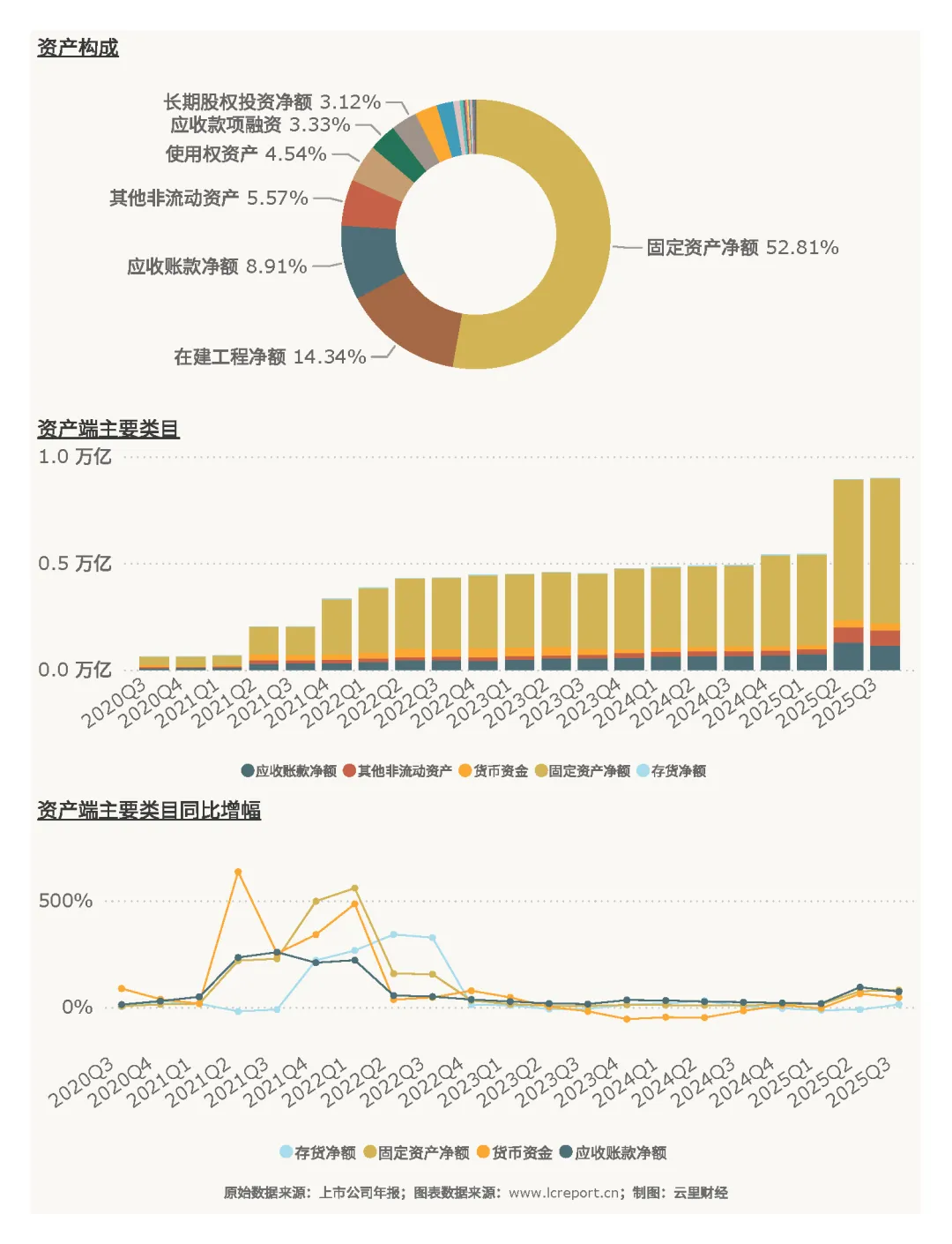 2025Q3 季度风电行业资产结构凸显重资产属性,各类资产占比中固定资产净额达 52.81%,为行业最核心的资产,风电电站、风机设备等固定资产是企业开展生产经营的基础,也是资产规模的主要构成;在建工程净额占比 14.34%,占比位居第二,反映风电行业仍处于产能扩张和项目建设的阶段,头部企业持续布局新的风电项目,推动在建工程规模保持高位;应收账款净额占比 8.91%,因风电行业项目付款周期较长,形成一定规模的应收账款,是经营性流动资产的主要组成;其他非流动资产(5.57%)、使用权资产(4.54%)、应收款项融资(3.33%)、长期股权投资净额(3.12%)占比均相对较低,对行业资产结构的影响有限。整体资产结构与风电行业的经营模式高度匹配,固定资产和在建工程的高占比决定了行业资产周转速度较慢、投资回收周期较长的特征。
