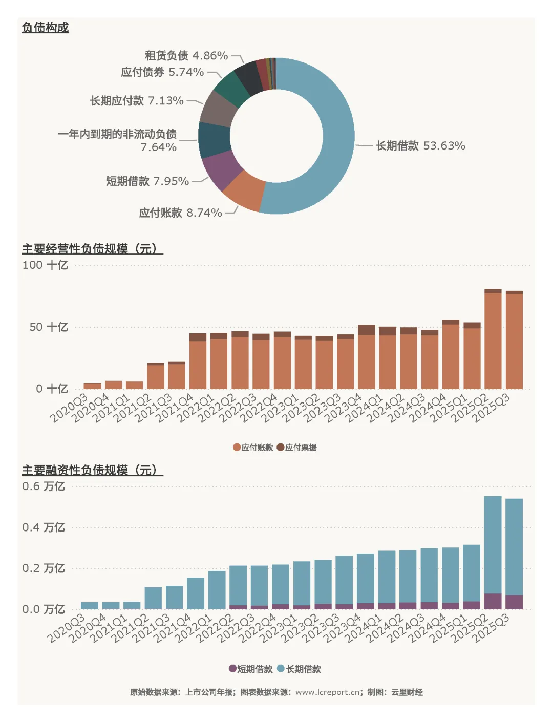2025Q3 季度风电行业负债结构以长期债务为主,与重资产、长周期的项目投资相适配,其中长期借款占比 53.63%,为最主要的负债类型,企业通过长期借款获取风电项目建设所需的大额资金,还款周期与项目投资回收周期匹配;短期借款占比 7.95%、一年内到期的非流动负债占比 7.64%,短期偿债压力相对较小;应付账款占比 8.74%,为经营性负债的主要组成,源于企业与上游供应商的正常商业往来;此外,长期应付款(7.13%)、应付债券(5.74%)、租赁负债(4.86%)占比均较低,构成行业负债的补充部分。整体负债结构合理,长期债务占比高的特征与风电行业的资产结构和经营周期相契合,有效降低了企业的短期流动性风险。