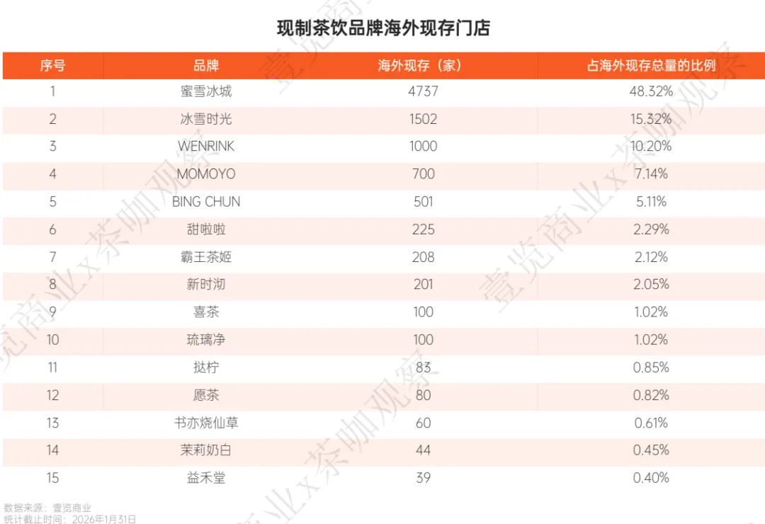 2026年,出海已从“加分项”变为“必选项”。报告详细记录了1月份中国现制茶饮品牌在海外市场的扩张数据以及现存门店数据。东南亚依然是主战场,但欧洲与北美市场正出现新的变量。