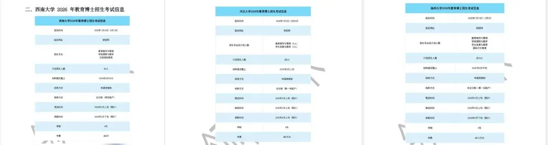 作为“时间轴指南”,精准汇总了每所院校2026年教育博士招生的核心考试信息。从网上报名起止时间、材料提交截止日期,到资格审核时间、考核安排(笔试/面试时间、地点、形式),再到招生计划名额、分方向招生人数,全部按院校分类整理,一目了然。