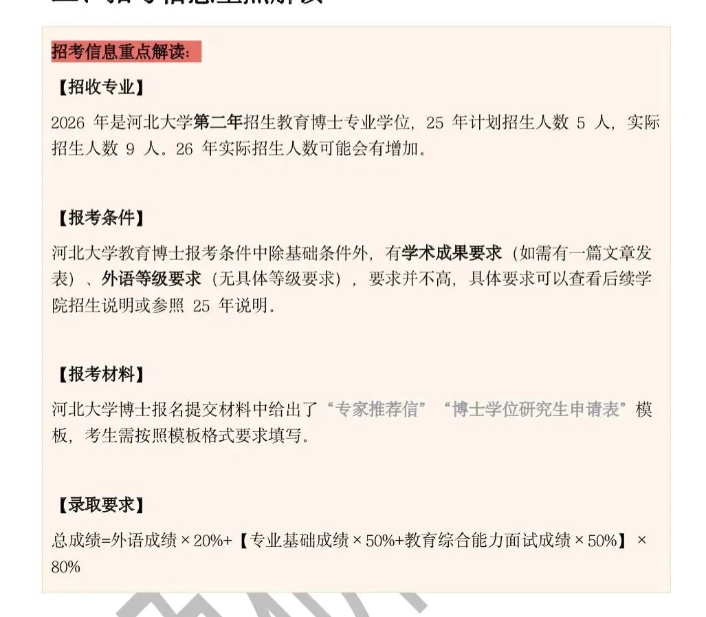 本模块针对每所院校的招考信息做深度拆解,直击核心痛点:解读“申请-考核制”的材料评议标准,明确科研成果的认可度边界;分析考核环节的权重分配,告知笔试、面试、材料评议的占比;提醒特殊政策要求,比如部分院校的“校内推荐”门槛、跨专业报考的附加条件。