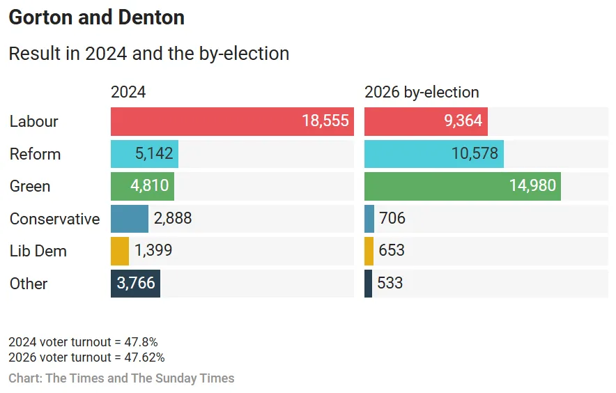 在戈顿与登顿选区(Gorton and Denton)的国会议员补选(by-election)中,绿党(Green Party)以绝对优势击溃执政工党,强夺了工党把持百年的钢铁票仓。