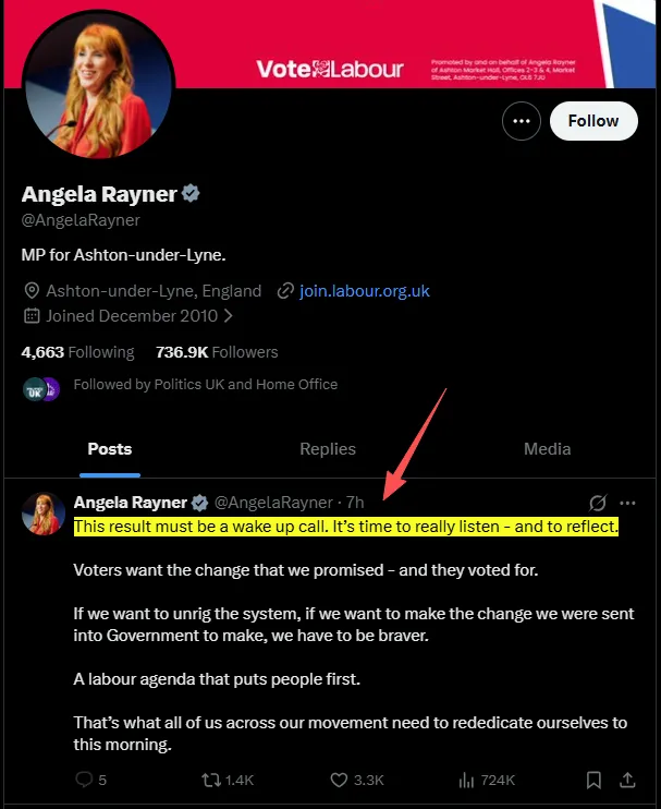 前副党魁雷纳(Angela Rayner)公开警告,这次败选是给工党「一记警钟(wake-up call)」,要求高层认真倾听、深刻反思。