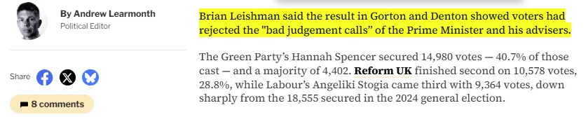 从工党内部角度看,这也是一记闷棍:因为本次大败证明了工党支持率的流失,并不只是「蓝色工党」(Blue Labour)常说的那种「因为政策太左,所以票才跑去改革党」。