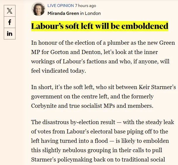如今绿党在工党铁票区的压倒性胜利,等同给工党高层一个明确信号:继续右转,不只会被骂,还会丢席位。