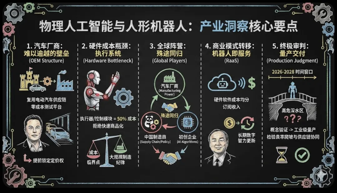 硬件成本的致命瓶颈死锁于执行系统。执行器和精密运动控制模块吞噬了高达一半的硬件物料清单预算,这类高度依赖机械公差与材料科学的组件拒绝被快速商品化,使得突破成本临界点的希望只能寄托于严苛的大规模制造纪律。 全球产业版图正加速向三大殊途同归的阵营收敛。牌桌上的玩家已被清晰划分为掌控制造霸权的汽车厂商、依托极致供应链成本和政策红利进行降维打击的中国制造商,以及固守前沿人工智能算法但受制于产能匮乏的专家型初创企业。 商业护城河将不可逆转地向机器人即服务模式转移。物理人工智能对持续大模型微调与海量数据吞吐的饥渴,注定会把系统全生命周期成本推向硬件与软件均分的全新平衡态,迫使全行业放弃一次性硬件买卖,转而通过长期的数字智力更新来榨取高利润率的订阅收入。 概念验证向工业级量产的终极审判迫在眉睫。整个行业正集体逼近从样机炫技向量产交付过渡的高危深水区,2026年至2028年的时间窗口将残忍剥去概念炒作的伪装,直接检验各家企业在良率爬坡与供应链协同上的真实底蕴。