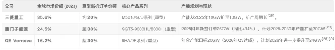 这一需求端的结构性变化,与全球能源转型(燃气轮机作为风电、光伏的优质调峰电源)、存量机组更换周期(上世纪90年代末安装的机组已进入寿命末期)以及电网升级需求形成共振,共同推高了全球燃气轮机的装机需求。然而,供给端却因极高的技术壁垒和寡头垄断格局而严重受限。全球燃气轮机市场,尤其是重型燃机(功率>100MW,占市场营收90%),长期被通用电气(GE Vernova)、西门子能源(Siemens Energy)和三菱重工(Mitsubishi Heavy Industries) 三家巨头垄断,合计占据全球约80%的重型燃机订单份额。这种“需求爆发”与“供给刚性”的错配,导致了显著的供需缺口。根据行业数据,2025年全球燃气轮机签订需求已超过80GW,但实际供给能力仅约50GW,缺口高达30GW2。这使得三大巨头的在手订单已排产至2028年底至2029年初,处于满负荷生产状态。行业呈现出鲜明的 “产能为王” 特征,任何能够提供有效产能的环节都成为稀缺资源。
