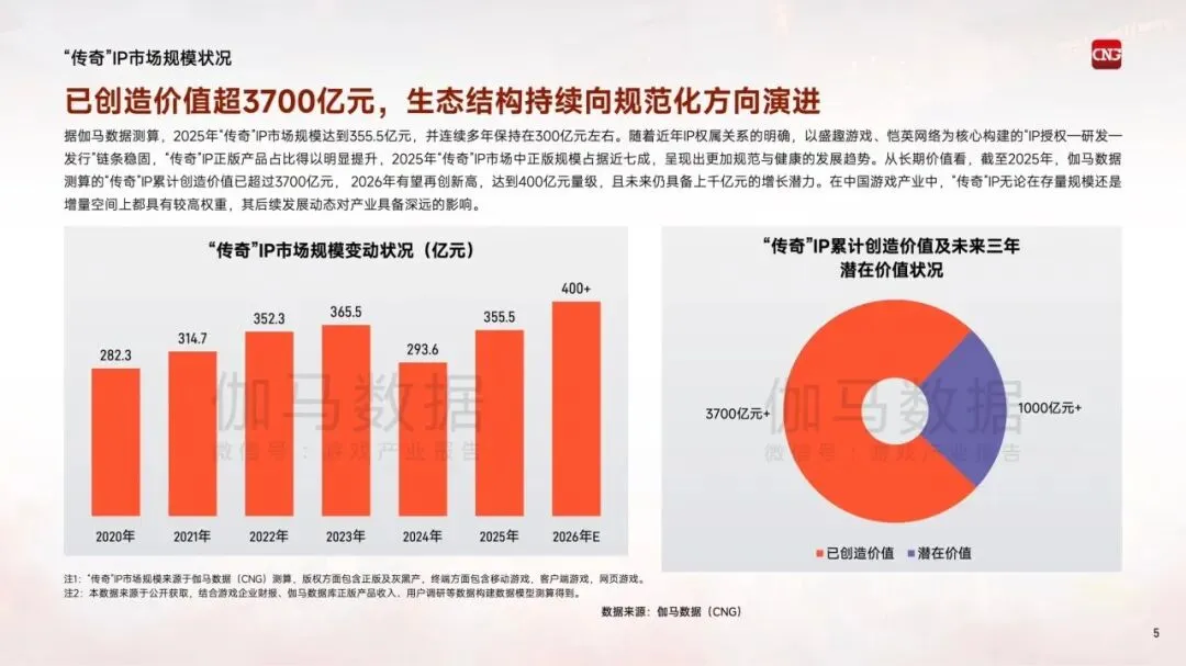 截至2025年,"传奇"IP累计创造价值已超3700亿元,2025年市场规模达355.5亿元,连续多年保持在300亿元左右,2026年有望突破400亿元。随着IP权属关系明确,正版产品占比近七成,生态结构持续向规范化方向演进。