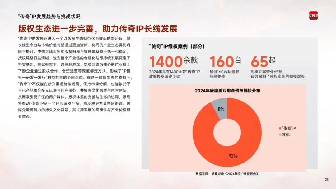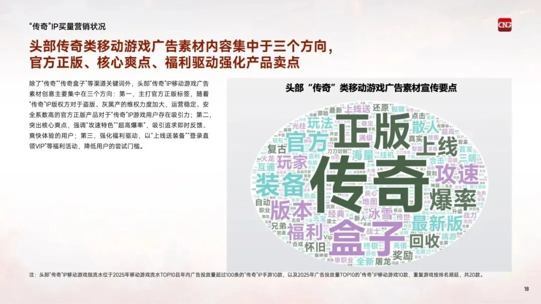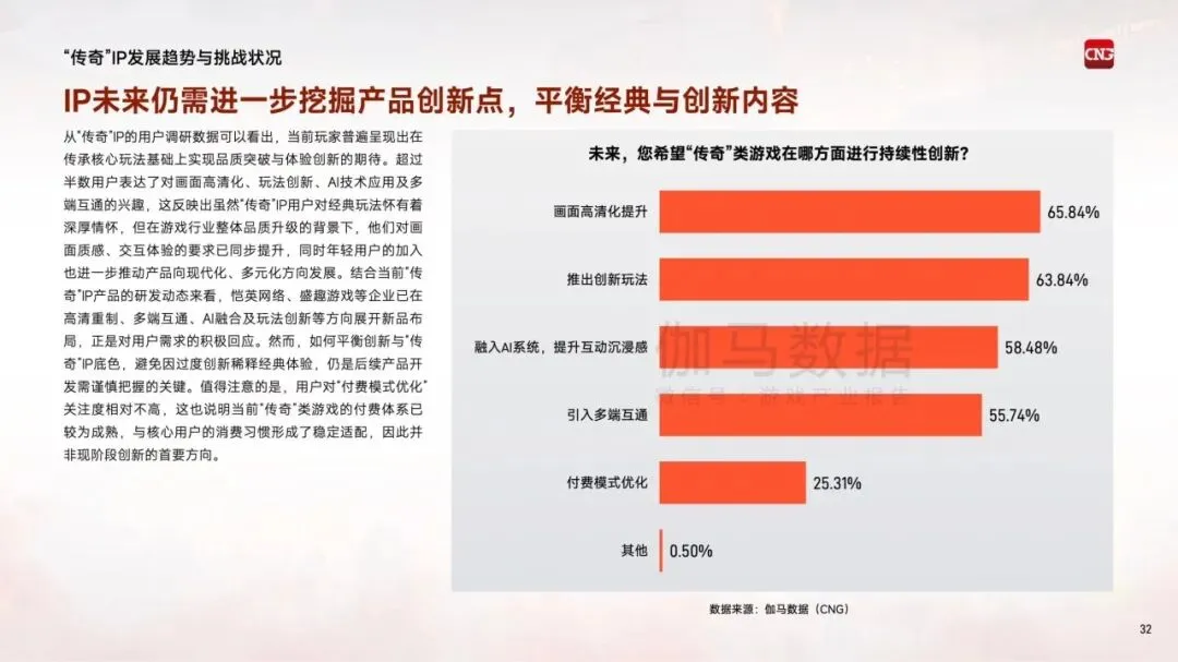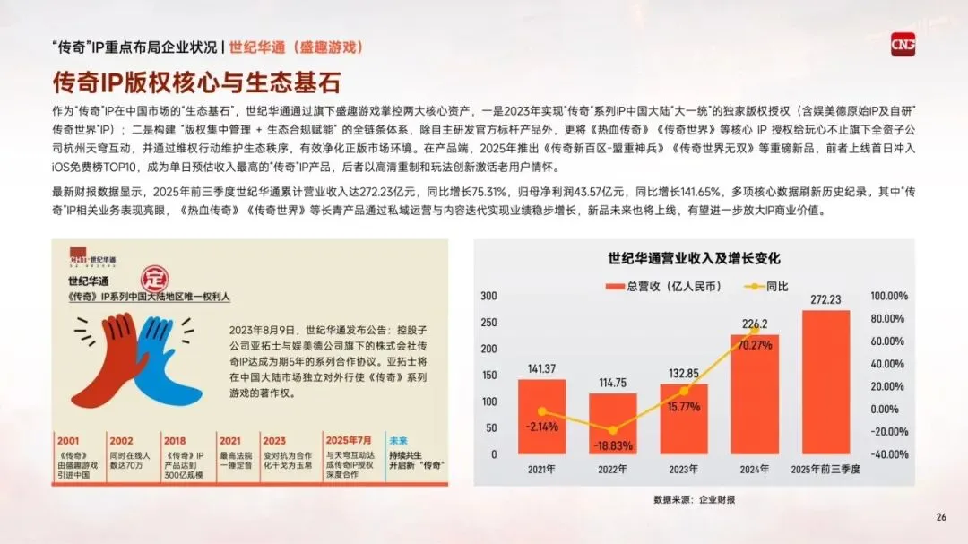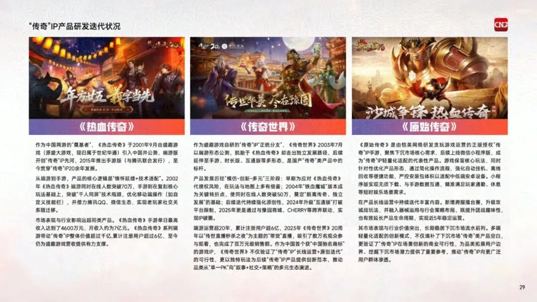 "传奇"IP自2001年进入中国市场,历经二十余年发展,已成为国内收入产出最高的客户端游戏IP之一。超九成游戏用户听说过该IP,超过五成用户实际体验过相关产品,可拓展用户规模超3亿人。