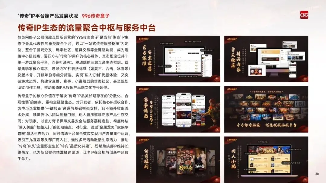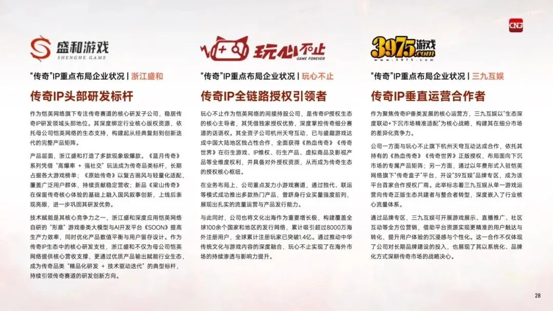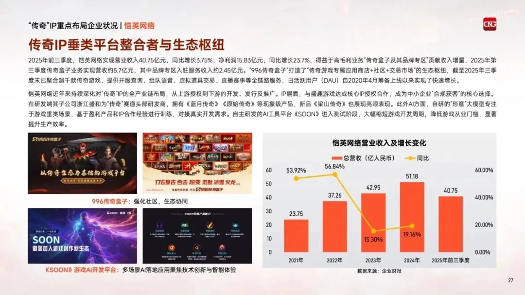 2025年,恺英网络旗下"传奇盒子"获得IP生态衍生内容授权,标志着"传奇"IP延伸至集游戏、直播、电竞等多元内容生态,未来仍具备上千亿元的增长潜力。