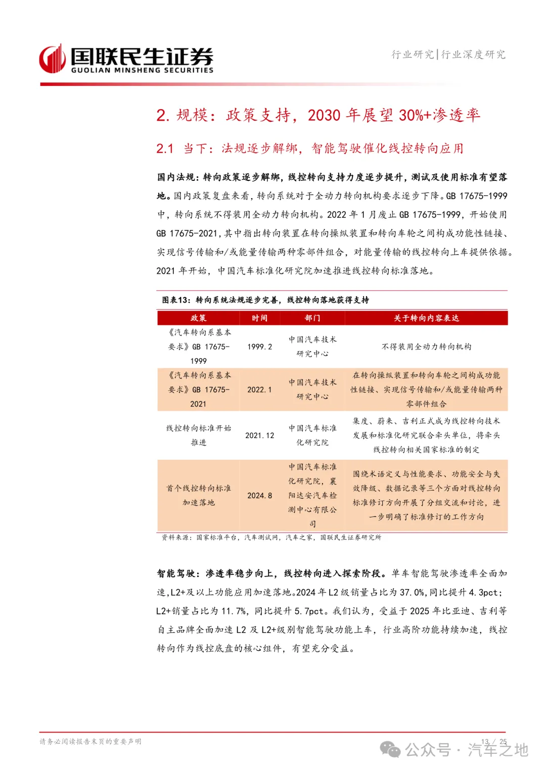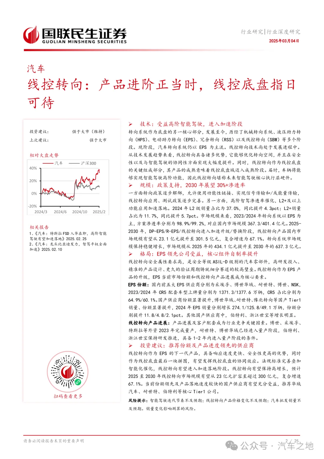 线控转向作为EPS的下一代产品,具备响应速度更快、安全性更高的优势,同时作为线控底盘最后一块拼图,有望发挥线控底盘的协同效应。法规标准完善叠加智能化催化,线控转向有望进入加速落地阶段。线控转向有望保持高增长,我们预计2025至2030年线控转向市场规模有望从23亿元扩容至超过300亿元,复合增速67.1%。