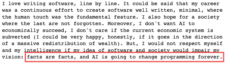 AI 会影响到 IT 行业的每一个人 ,似乎有的时候会感到迷惘和无助,我觉得 Redis 之父 antirez 这篇文章的结尾会给大家带来一点温暖和启发。
