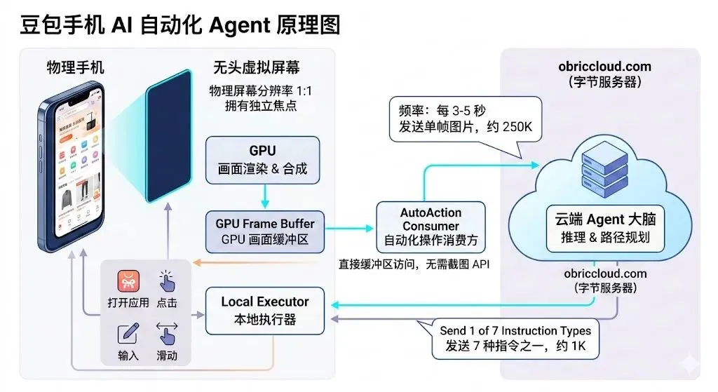 1、豆包手机在执行自动操作时,会利用一个与物理屏幕分辨率相同的“无头”虚拟屏幕在后台运行,且拥有独立的焦点,不影响用户在前台的操作,这其实就是内存副屏的概念, 虚拟屏幕的画面由 GPU 合成后,对应的缓冲区信息会直接被autoaction消费 。