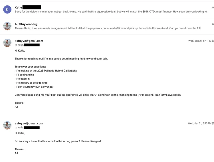 经过三天的自动化邮件谈判,最终成交价锁定在 56,000 美元,比标价低约 4,200 美元,低于 Stuyvenberg 设定的 57,000 美元心理预期。整个过程中,他没打过电话,也没踏进过一家 4S 店。