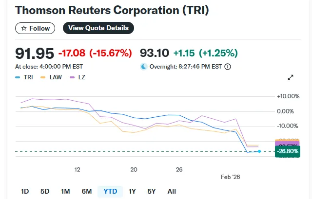 整个板块的抛售压力显而易见:拥有大型数据分析业务的伦敦证券交易所集团(LSEG)下跌13%,汤森路透暴跌16%,CS Disco Inc.下跌 12%,Legalzoom.com Inc. 则惨跌 20% 。