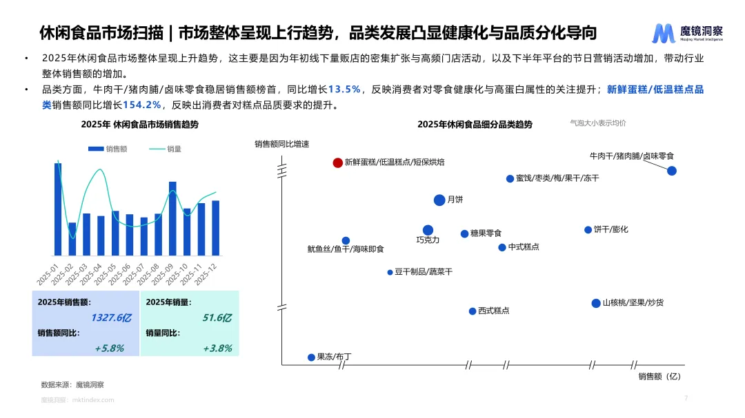 食品饮料市场在2025年整体规模达到5936.7亿元,销售额同比增长7.8%,销量增长6.3%,均价上涨1.4%。量价双增推动市场规模持续扩大。从细分品类看,冲调泡、米面粮油及调味品表现突出,增速显著;休闲食品、饮料和乳制品也保持稳定增长,其中冲调泡品类增速最快。消费者对“质价比+健康+功效”的综合需求正在改变行业格局。健康化成为食品饮料赛道的核心趋势,新鲜蛋糕、豆浆、植物饮料等产品凭借品质提升和健康概念受到欢迎。高价位产品如百元以上全龄段奶粉、养生酒等与平价产品如豆类、软糖共同增长,形成价格分层的市场结构。儿童奶粉因精准营养定位,实现17%的增速。休闲食品市场达1327.6亿元,同比增长5.8%。牛肉干、卤味零食和新鲜蛋糕引领增长,反映高蛋白和高品质需求的提升。情绪类品类增速最快,文化IP联名和地域特色产品受关注,药食同源、低GI、功能定制成为新品重点方向。高蛋白赛道规模达124.7亿元,同比增长12.5%,成为核心增长动力。虾类原料增速达59.3%,牛鸡等基础蛋白为主,工艺上以风干、原切和非油炸为主,强化健康低脂趋势。饮料市场呈现“风味承载规模、功能贡献增速”的特点。风味仍是主要销售支撑,但功能、养生及电解质等卖点增速更快,推动结构变化。创新多围绕健康和功能展开,但当前体量仍低于风味类产品。饮料市场由成熟卖点维持规模,同时通过细分功能实现结构增长。