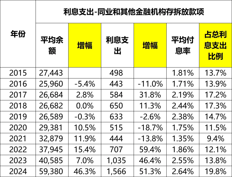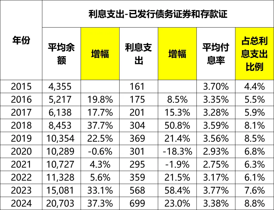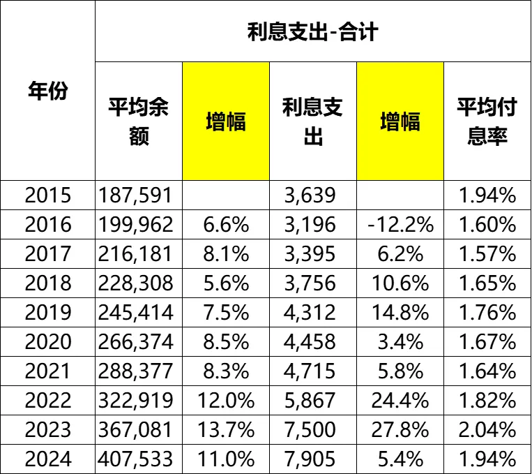 对比2022、2023两年的平均余额和利息支出会发现,这两年的利息支出远高于余额增长。