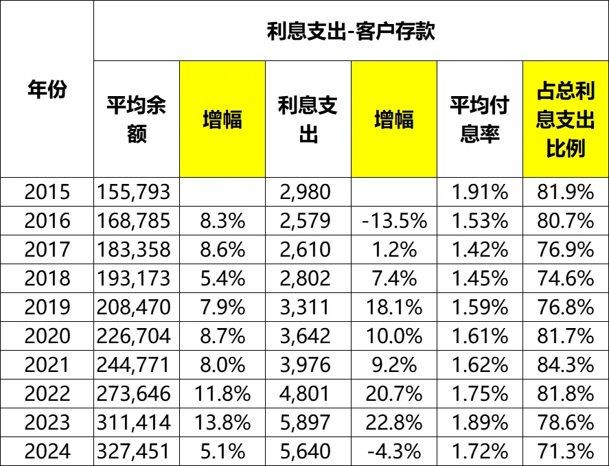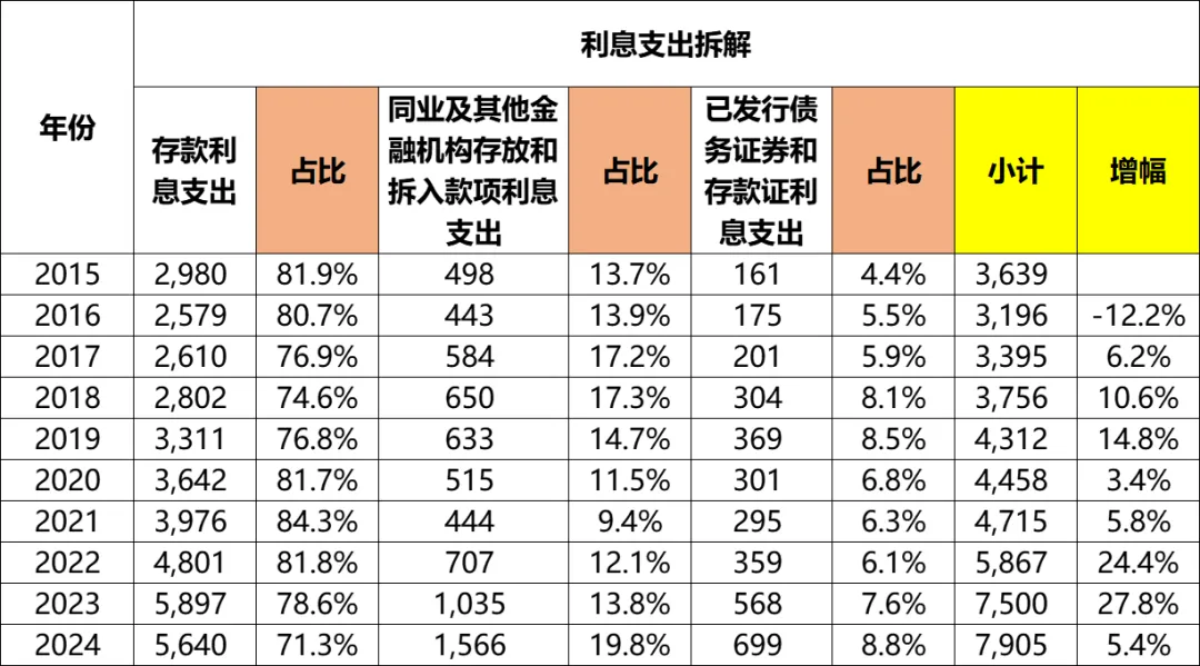 从占比来看,大头是客户存款利息支出,2015~2024年占比介于71.3%~84.3%。2022~2024年占比分别为81.8%、78.6%、71.3%。