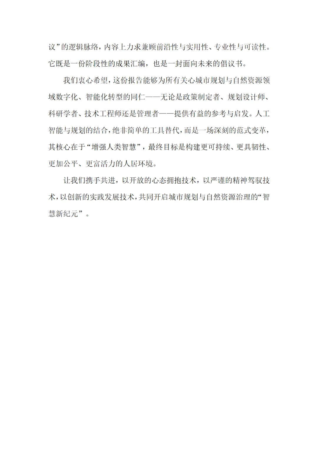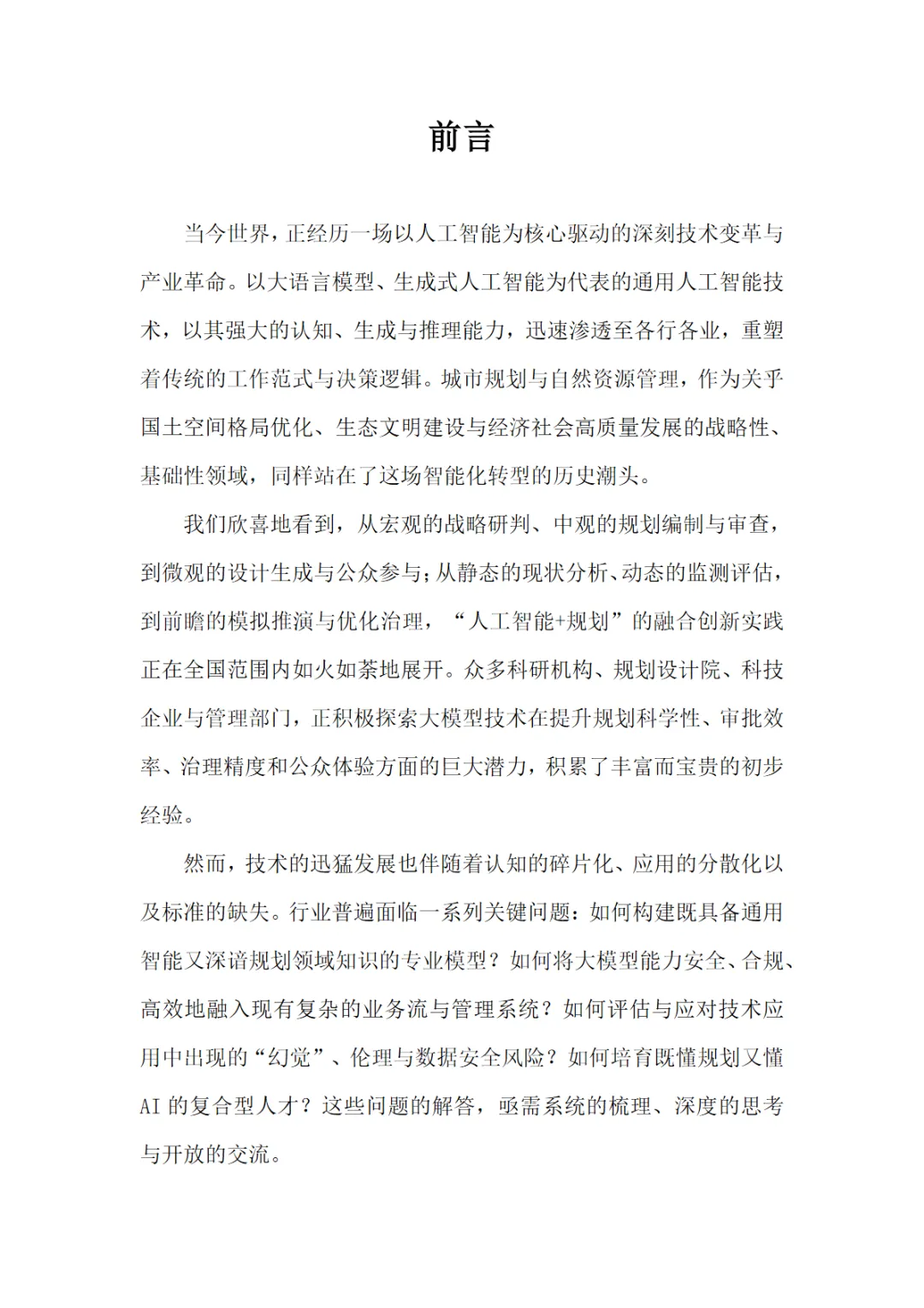 本篇行业报告可以通过扫下方知识星球下载。39元就可以下载星球所有报告。免费提供报告查找服务。在当今世界,人工智能技术正引领着一场深刻的技术变革和产业革命。特别是在城市规划与自然资源管理领域,人工智能技术的应用正在重塑传统的工作模式和决策逻辑。从宏观的战略研判到微观的设计生成,人工智能技术的应用正在全国范围内展开,推动着行业的智能化转型。随着大语言模型和生成式人工智能技术的发展,城市规划和自然资源管理领域正经历着从信息化到智能化的转变。这些技术以其强大的认知、生成和推理能力,为规划科学性、审批效率、治理精度和公众体验的提升提供了巨大潜力。然而,技术的快速发展也带来了认知的碎片化、应用的分散化以及标准的缺失,行业面临构建专业模型、融入复杂业务流程、评估伦理和数据安全风险等关键问题。为了应对这些挑战,中国城市规划学会城市规划新技术应用专业委员会组织编写了一份报告,旨在系统梳理大模型技术在国土空间规划全生命周期和自然资源管理各环节的创新应用图谱,从基础理论、模型构建、技术方法到场景实践,进行系统性梳理与展示。报告还深度解析了一批具有代表性的前沿探索与落地案例,揭示了背后的技术逻辑、实施路径与得失思考,为同行提供了可借鉴、可参考的实践范本。报告强调,人工智能与规划的结合不仅仅是工具替代,而是一场深刻的范式变革,其核心在于“增强人类智慧”,最终目标是构建更可持续、更具韧性、更加公平、更富活力的人居环境。因此,我们需要以开放的心态拥抱技术,以严谨的精神驾驭技术,以创新的实践发展技术,共同开启城市规划与自然资源治理的智慧新纪元。免责声明:以上分享报告为公开合法渠道获得,内容大部分来源于网络,版权归原作者所有,如有侵权,请及时与我们联系,我们将第一时间保障您的权益。推荐内容仅供参考学习,不构成投资建议。