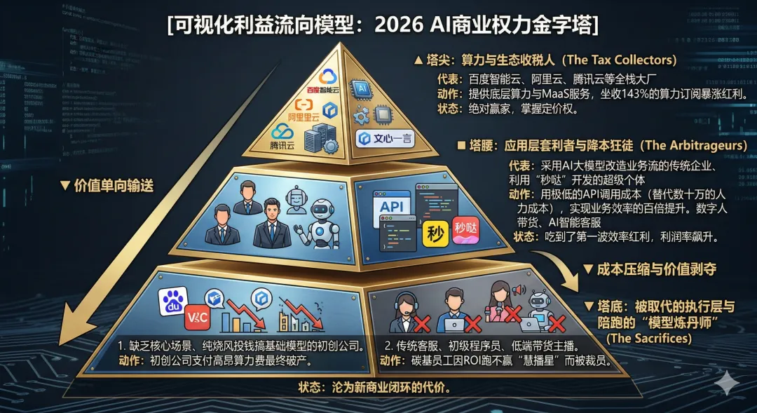 看透了逻辑,我们需要在上帝视角下绘制一张2026年AI商业生态的利益相关者地图。在这个局里,谁在做局?谁是耗材?谁在买单?看清这张地图,是你避免成为代价的唯一路径。在这张残酷的利益地图中:最大且最隐蔽的做局者,是百度这样的“基建狂魔”。李彦宏在Q4业绩电话会上的一句话暴露出极强的战略定力:“我们始终认为应用比模型更重要,因为模型的价值最终要通过应用来实现。”这句话翻译成商业语言就是:别去搞那些虚无缥缈的基础理论研究了,赶紧把模型拿到具体的业务场景里去赚钱。百度主动拆分研发团队,一支死磕前沿,一支下放业务线“聚焦降本、提效、提速”。他们非常清楚,不能落地的AI就是一团消耗电力的废铁。最可悲的牺牲品,是那些陷入“自研模型”执念的腰部企业与创业者。很多企业老板被前两年的焦虑裹挟,砸重金试图训练自己的专属大模型,最终发现每年的算力折旧和人才成本足以让公司破产。他们就像是十九世纪试图自己建发电厂来开纺织厂的封建领主,最终只能在耗尽现金流后,乖乖接入大厂的“共和电网”。最冷酷的受益者,是那些果断向员工挥舞AI屠刀的企业主。AI原生营销服务收入同比激增301%,这绝不是凭空变出来的钱。这是千万家传统企业砍掉了广告代理商的中间差价,砍掉了低效的外包团队,将预算直接砸向了AI营销平台。在这场零和博弈中,算法的胜利,本质上是对低效碳基劳动的系统性抹杀。结语