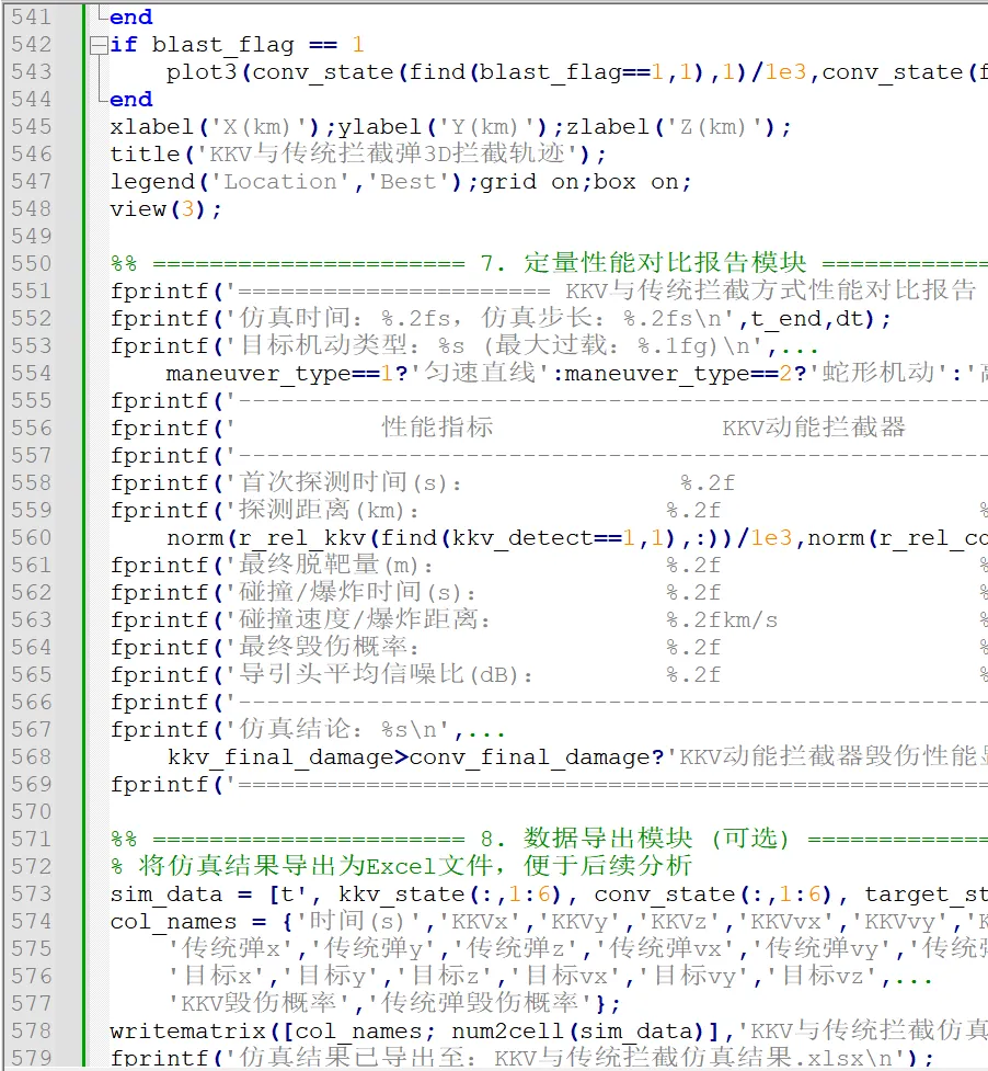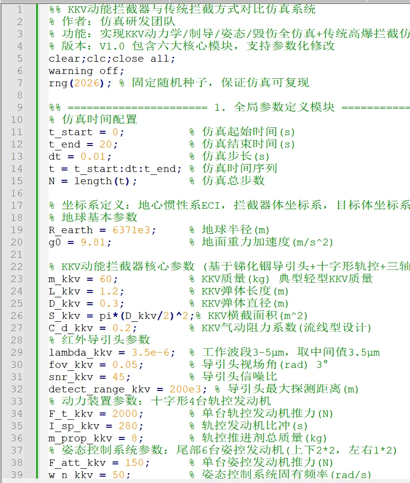 该仿真代码实现 KKV 全流程动力学仿真、红外导引头探测、制导控制、姿态稳定、动能碰撞毁伤,以及传统高爆拦截的碎片杀伤仿真,包含动力学建模、导引头仿真、制导控制、姿态控制、毁伤评估、对比分析六大模块,具备可参数化调整、可视化仿真结果、定量对比分析的特点。