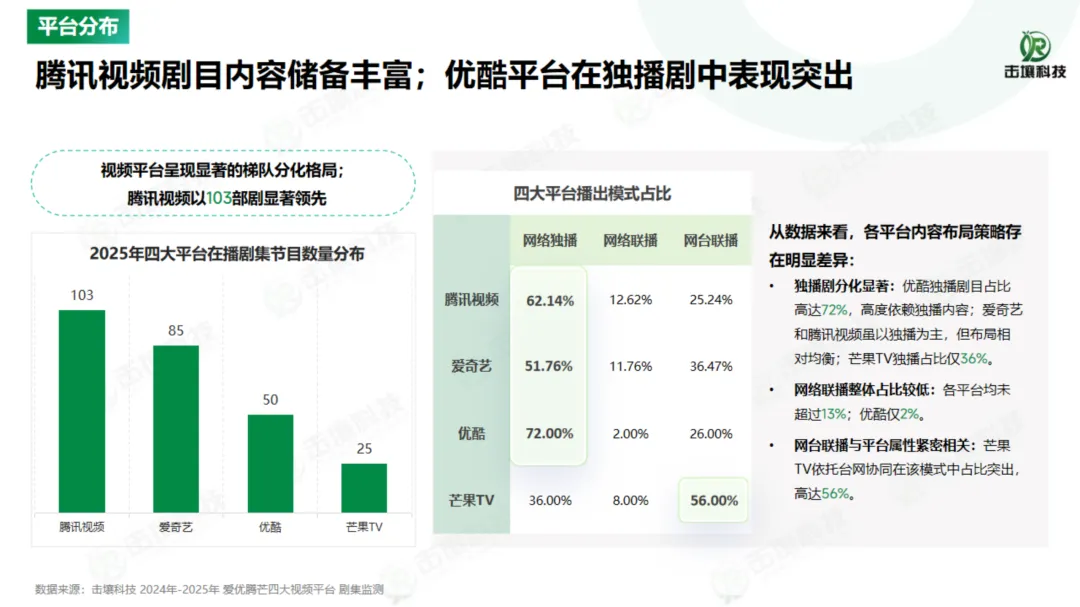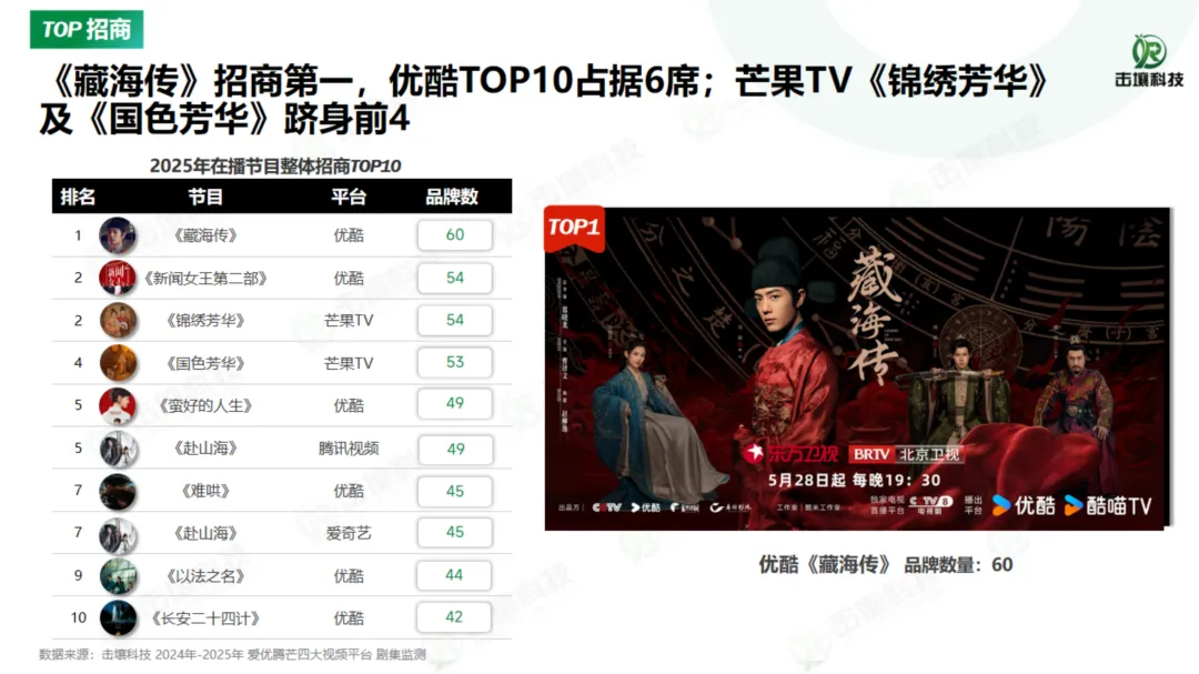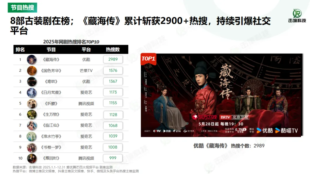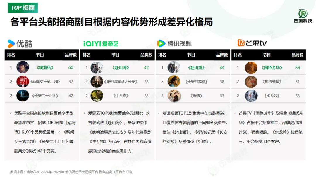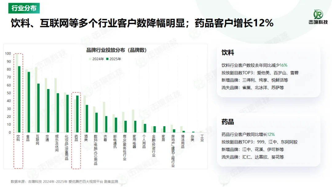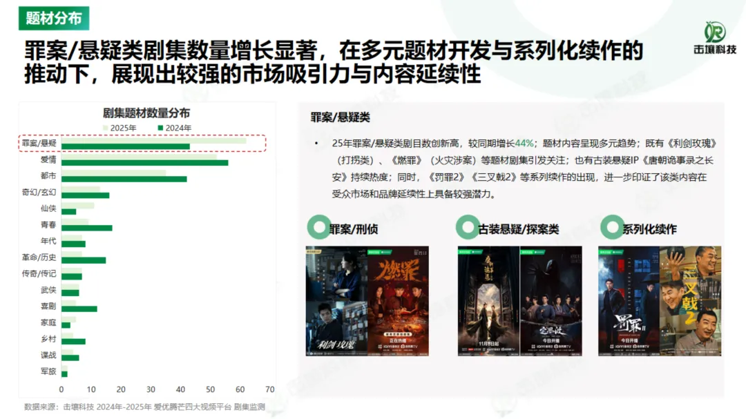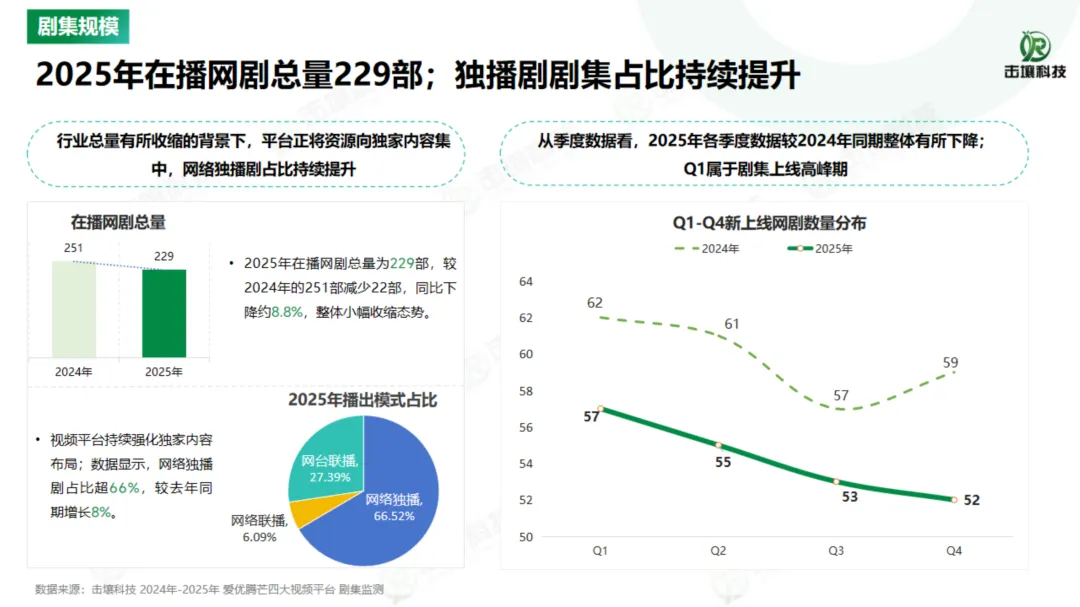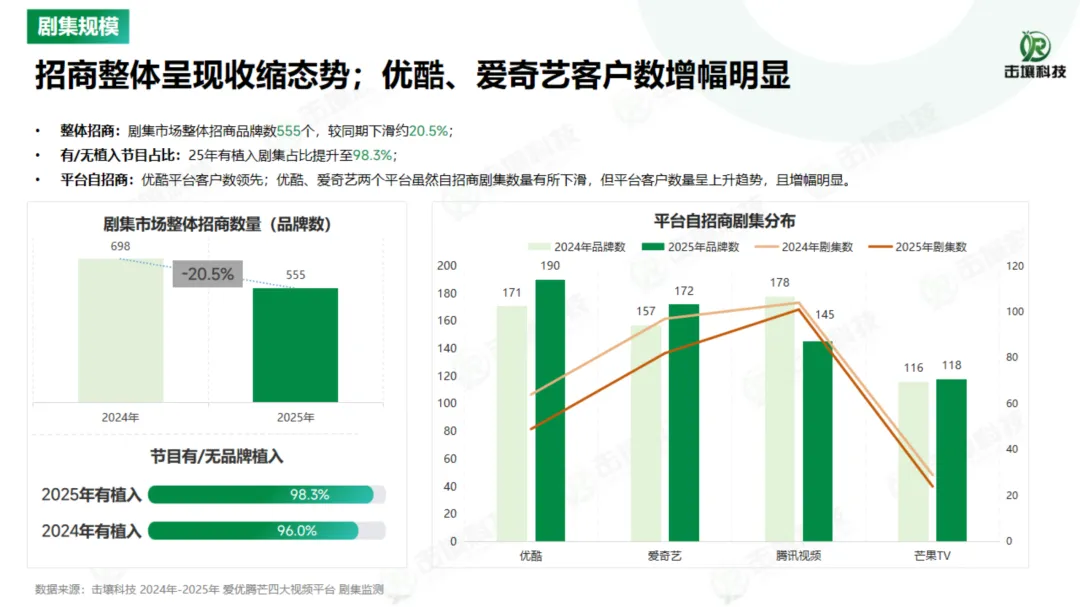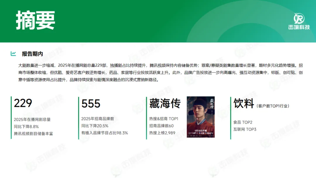 2025年网剧市场整体呈现小幅收缩态势,全年在播网剧总量为229部,较2024年的251部减少22部,同比下降约8.8%。从季度分布来看,各季度新上线剧集数量均有所下降,其中第一季度为剧集上线高峰期。网络独播剧占比持续上升,全年占比超过66%,较去年同期增长8%。平台内容布局进一步向独家资源倾斜,显示出对独播内容的重视。在题材方面,罪案与悬疑类剧集数量显著增加,反映出市场对这类题材的偏好增强,同时整体题材呈现多元化趋势。招商市场整体规模有所缩减,但部分平台如优酷和爱奇艺仍保持客户数量增长,药品、家居等行业的投放活跃度提升。品牌广告投放更倾向于高曝光、强互动的资源,标版、创可贴及创意中插等新型广告形式使用比例上升,品牌正在探索与剧情深度融合的沉浸式营销方式。腾讯视频在剧目储备方面表现突出,其内容覆盖广泛,有植入品牌的节目占比达98.3%。此外,2025年在播剧集中,食品行业投放热度居前,互联网行业紧随其后,饮料行业则位居客户数第一。多个剧集登上热搜榜单,显示内容影响力持续增强。