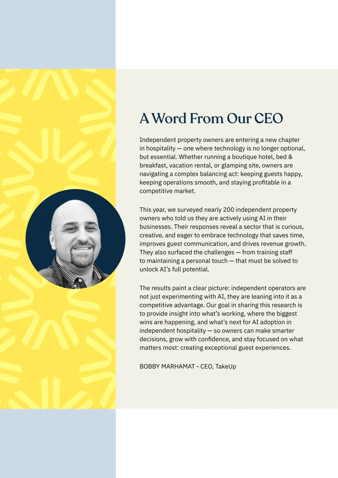 由行业领先平台TakeUp发布的《2025年酒店业人工智能(AI)革命研究报告》,基于对200位活跃使用AI技术的独立物业主(涵盖民宿、精品酒店、露营地及小型旅馆)的深度调研,揭示了一个被忽视却至关重要的真相:AI的普及浪潮正从“自上而下”转向“自下而上”。