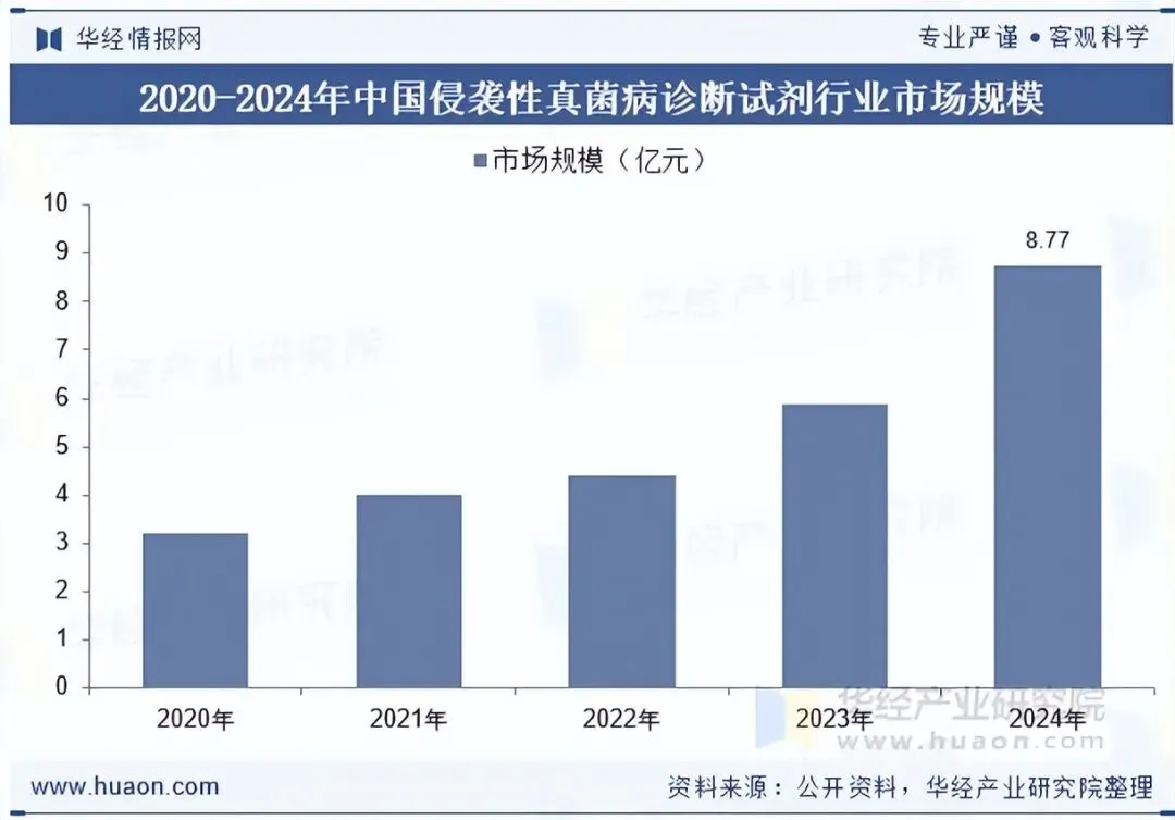 2024年中国侵袭性真菌病诊断试剂行业市场规模已达到约8.77亿元。侵袭性真菌病诊断试剂行业规模的形成,一方面源于临床需求的持续释放,随着血液肿瘤、器官移植患者数量增加,以及抗菌药物不合理使用导致侵袭性真菌感染发病率上升,医疗机构对精准诊断试剂的采购需求显著增长;另一方面得益于技术迭代推动,分子诊断、抗原检测等技术的成熟应用,提升了产品临床价值,进一步扩大了市场覆盖面。