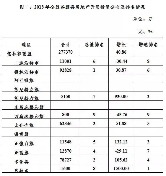 2018年,全盟共有9个旗县完成房地产开发投资,阿巴嘎旗、苏尼特左旗、东乌珠穆沁旗和镶黄旗四个地区无房地产开发投资。房地产开发投资总量排在前三位的地区是:锡林浩特市(9.28亿元)、多伦县(7.87亿元)、太仆寺旗(6.28亿元)。增速排在前三位的地区是:乌拉盖管理区(增长15倍)、苏尼特右旗(增长9.3倍)、正镶白旗(增长1.3倍)。