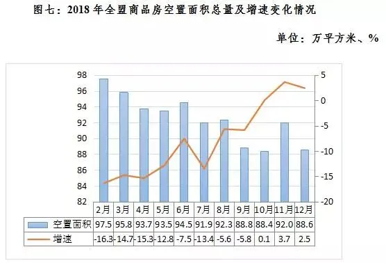 2018年,全盟商品房空置面积呈现持续性下降态势,个别月份虽有反弹,但总体为下降趋势。与上年同期相比,商品房空置面积前三季度降幅持续收窄,四季度低速上涨。