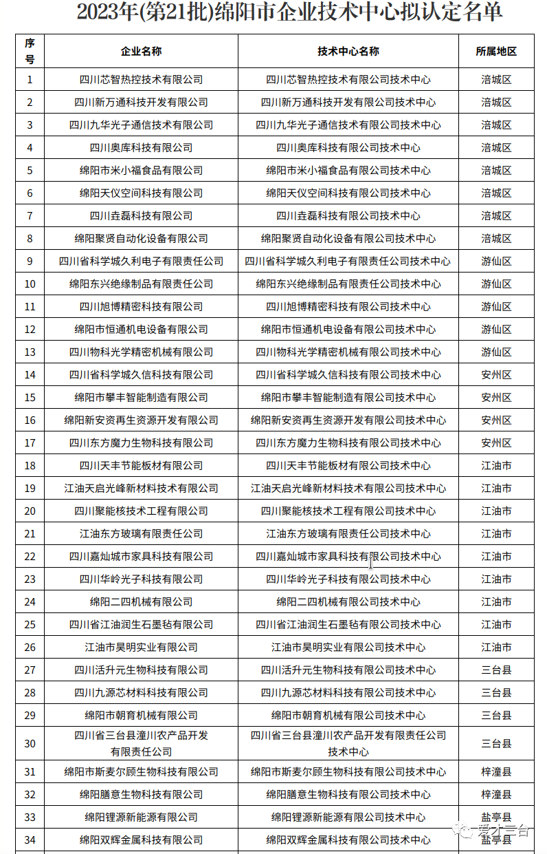 关于拟认定2023年(第21批)绵阳市企业技术中心的公示