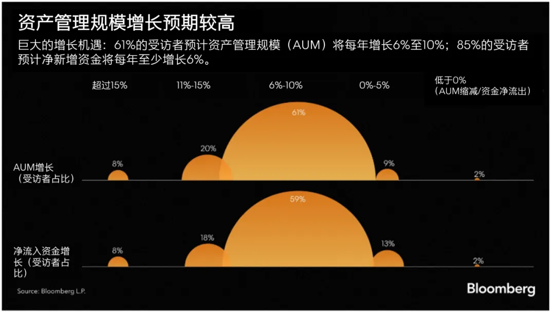 调查结果呈现了强劲的市场前景:61%的受访者预计资产管理规模将每年增长6%至10%,85%的受访者预计净新增资金将每年增长6%或以上。支撑这一乐观情绪的,是一系列强劲的结构性驱动因素——区域财富增长、代际财富转移、跨境资金流入,以及中国在海外市场的更深度参与。