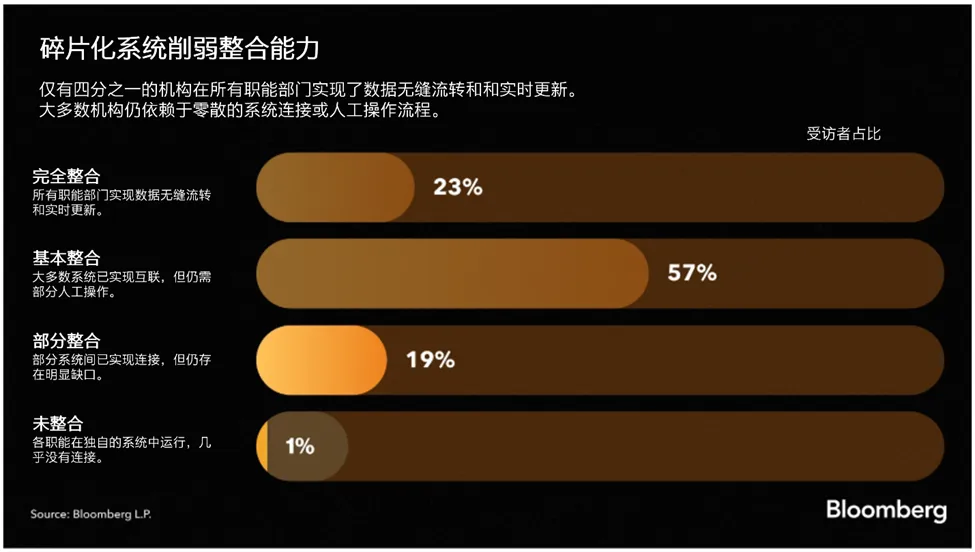 尽管面临巨大的增长机遇,但大多数私人银行和家族办公室在架构上尚未做好充分准备。其工作流程、数据系统和技术平台仍然高度分散,形成信息孤岛,依赖大量人工操作,拖慢决策效率。仅有23%的受访机构表示其前台、中台和后台系统已实现全面整合,57%的受访机构称实现部分整合。