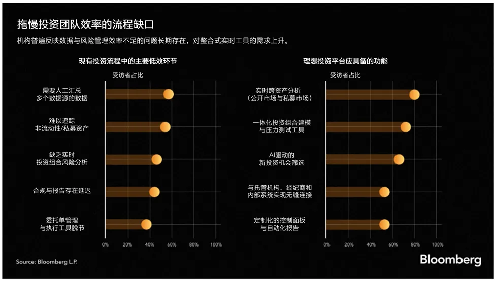 碎片化系统还削弱了风控能力:47%的受访者表示,由于缺乏实时的投资组合风险分析工具,他们无法有效追踪风险敞口或进行压力测试。这些运营层面的低效之处已成为财富管理机构的日常痛点,不仅拖累效率、掩盖风险,还限制了业务的规模化扩张能力。