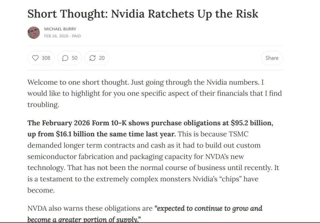 三是这次直接点火的是大空头迈克尔·伯里。他在社交媒体上直接点名财报里的一个数字:英伟达的“采购义务”从一年前的160亿美元涨到950亿美元。这笔钱是提前付给台积电锁定产能的不可取消订单。如果未来AI热潮退潮,这部分钱就可能变成负担。伯里说这有“灾难性”风险,市场情绪一下就被带崩了。