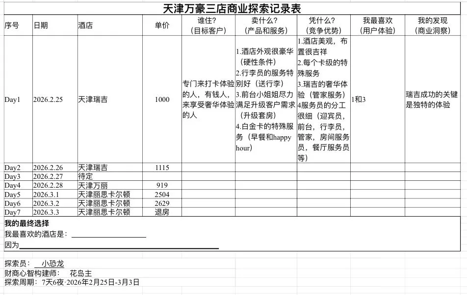昨晚睡前,我拿出天津三店商业探索的表格,陪着小恐龙把他用半天时间观察、感受、思考得出的答案,一个个填了进去。