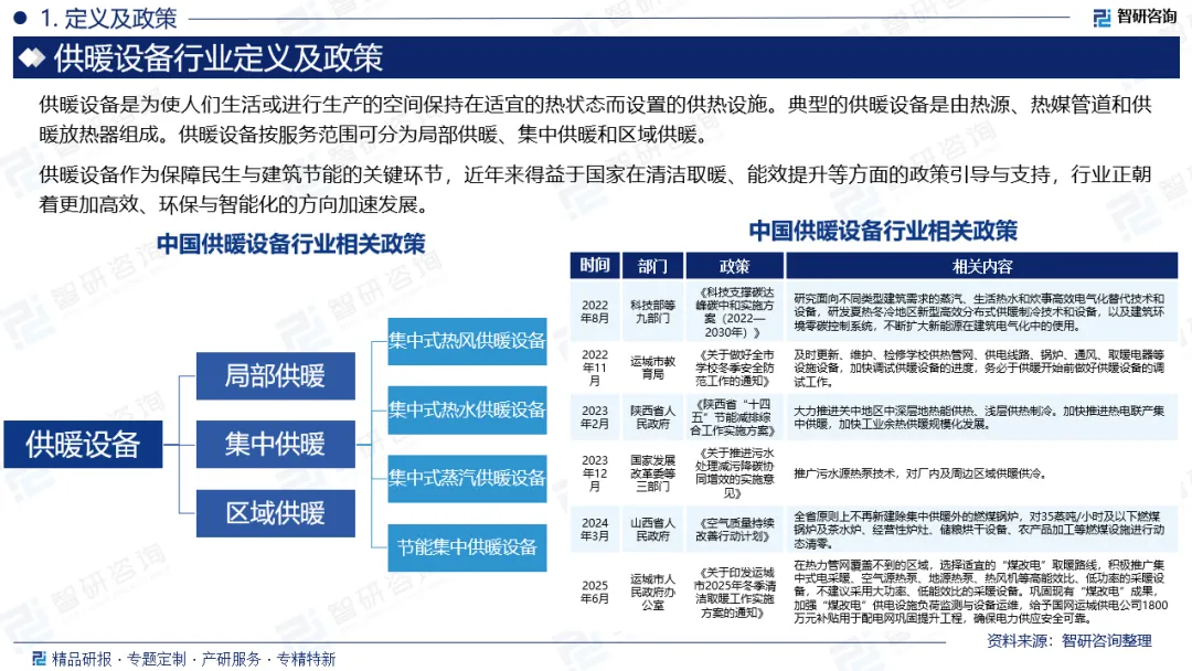 行业政策:供暖设备作为保障民生与建筑节能的关键环节,近年来得益于国家在清洁取暖、能效提升等方面的政策引导与支持,行业正朝着更加高效、环保与智能化的方向加速发展。例如,2023年12月,国家发展改革委等三部门印发《关于推进污水处理减污降碳协同增效的实施意见》,推广污水源热泵技术,对厂内及周边区域供暖供冷。2025年6月,运城市人民政府办公室印发《关于印发运城市2025年冬季清洁取暖工作实施方案的通知》,在热力管网覆盖不到的区域,选择适宜的“煤改电”取暖路线,积极推广集中式电采暖、空气源热泵、地源热泵、热风机等高能效比、低功率的采暖设备,不建议采用大功率、低能效比的采暖设备。巩固现有“煤改电”成果,加强“煤改电”供电设施负荷监测与设备运维,给予国网运城供电公司1800万元补贴用于配电网巩固提升工程,确保电力供应安全可靠。