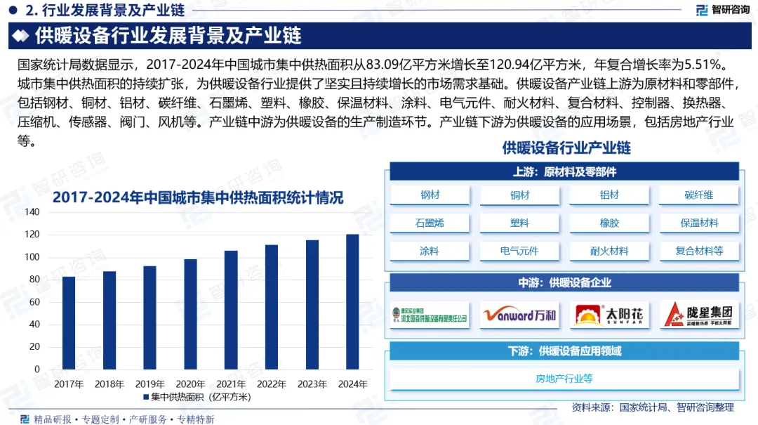 行业发展背景:随着我国城市化进程的持续推进,城市人口不断增加,新增建筑对供热的需求持续扩大,与此同时,居民对舒适生活环境的需求不断提升,也推动集中供热行业快速发展。国家统计局数据显示,2017-2024年中国城市集中供热面积从83.09亿平方米增长至120.94亿平方米,年复合增长率为5.51%。城市集中供热面积的持续扩张,为供暖设备行业提供了坚实且持续增长的市场需求基础。