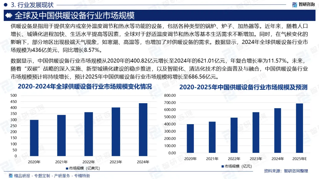供暖设备是为使人们生活或进行生产的空间保持在适宜的热状态而设置的供热设施。典型的供暖设备是由热源、热媒管道和供暖放热器组成。其中,传统的供暖热源是燃烧燃料或用电热元件产热。随着化石燃料(煤、石油等)来源日趋紧张,回收工业生产排放的余热和收集并利用大自然中存在的热已成为很受重视的供暖热源。供暖设备所用的热媒通常是空气、蒸汽或热水。放热器是装置在受暖房间里的热媒通道。它具有曲折延展的表面,使热媒流过它时便于把热量传给受暖的空间。近年来,随着人口增长、城镇化进程加快、生活水平提高等因素,全球对于舒适温度调节和热水等基本生活需求不断增加。同时,在气候变化的影响下,部分地区出现极端天气现象,如寒潮、高温等,也增加了对供暖设备的需求。数据显示,2024年全球供暖设备行业市场规模为436亿美元,同比增长8.57%。未来,随着全球能源结构向绿色低碳加速转型以及智能化技术的深度融合,供暖设备行业将朝着更高能效、更低排放、更智能互联的方向系统性演进。中国供暖设备行业近年来的蓬勃发展,主要得益于居民生活水平提升与政策支持的双重驱动。随着消费者对生活舒适度要求的提高,其需求已从基础的取暖功能,向追求更高能效、智能化控制及环保特性转变。与此同时,国家在节能环保与清洁能源领域的政策引导,为行业技术升级与市场拓展创造了有利环境。在技术层面,行业持续引入并研发智能化控制、高效热交换及低氮燃烧等先进技术,显著提升了产品的性能与能效,不仅契合了市场需求,也为行业的绿色可持续发展提供了核心支撑。在此背景下,中国供暖设备市场规模快速增长。数据显示,中国供暖设备行业市场规模从2020年的400.82亿元增长至2024年的621.01亿元,年复合增长率为11.57%。未来,随着“双碳”战略的深入实施、新型城镇化建设的稳步推进,以及智能化、清洁化技术的全面普及与融合,中国供暖设备行业市场规模预计将持续增长,预计2025年中国供暖设备行业市场规模将增长至686.56亿元。中国供暖设备行业呈现国际化与本土化并存、市场竞争层次分明的格局。以威能、博世、阿里斯顿为代表的国际品牌凭借其深厚的技术积累、品牌影响力和高端产品定位,在系统集成、高端壁挂炉及全屋解决方案市场占据优势地位。与此同时,以万和、太阳花、国森等为代表的国内领军企业,依托对本土消费需求的深刻理解、完善的渠道网络以及显著的性价比优势,在中端及大众市场建立了稳固根基。此外,众多区域性及细分领域的中小企业也在差异化市场中寻求发展。当前,行业竞争正从产品与价格,向技术迭代、系统服务能力与能源综合解决方案等维度深化拓展。