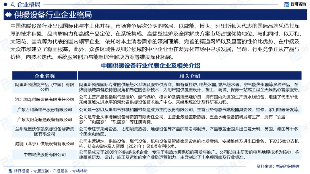 企业格局:中国供暖设备行业呈现国际化与本土化并存、市场竞争层次分明的格局。以威能、博世、阿里斯顿为代表的国际品牌凭借其深厚的技术积累、品牌影响力和高端产品定位,在系统集成、高端壁挂炉及全屋解决方案市场占据优势地位。与此同时,以万和、太阳花、国森等为代表的国内领军企业,依托对本土消费需求的深刻理解、完善的渠道网络以及显著的性价比优势,在中端及大众市场建立了稳固根基。此外,众多区域性及细分领域的中小企业也在差异化市场中寻求发展。当前,行业竞争正从产品与价格,向技术迭代、系统服务能力与能源综合解决方案等维度深化拓展。