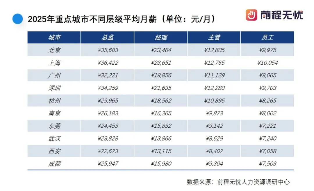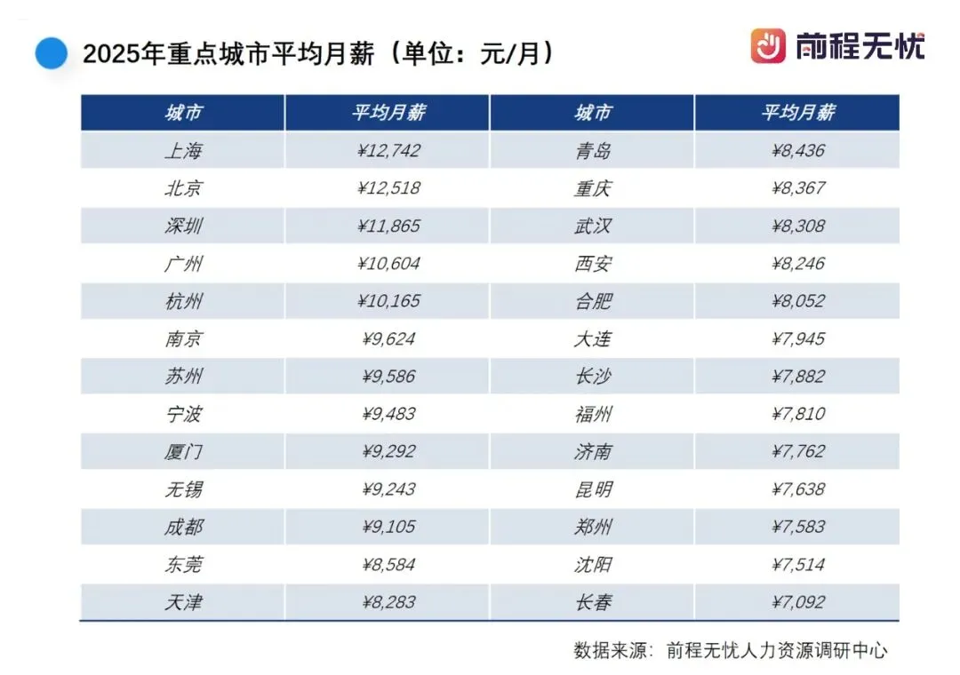 来自前程无忧的薪酬调查数据显示,在2025年全国重点城市月薪统计排名中,一线城市的薪资排名优势明显,其中上海(12,742元/月)和北京(12,518元/月)表现最为突出,这反映出高新产业及高级人才密度对薪酬的强大支撑。而新一线城市的薪资追赶速度正在加快,杭州(10,165元/月)、南京(9,624元/月)等薪酬水平接近广州(差距<¥1,000),显示长三角经济圈的辐射效应。鉴于新一线城市生活成本相对较低,未来极有可能成为“高性价比就业中心”。