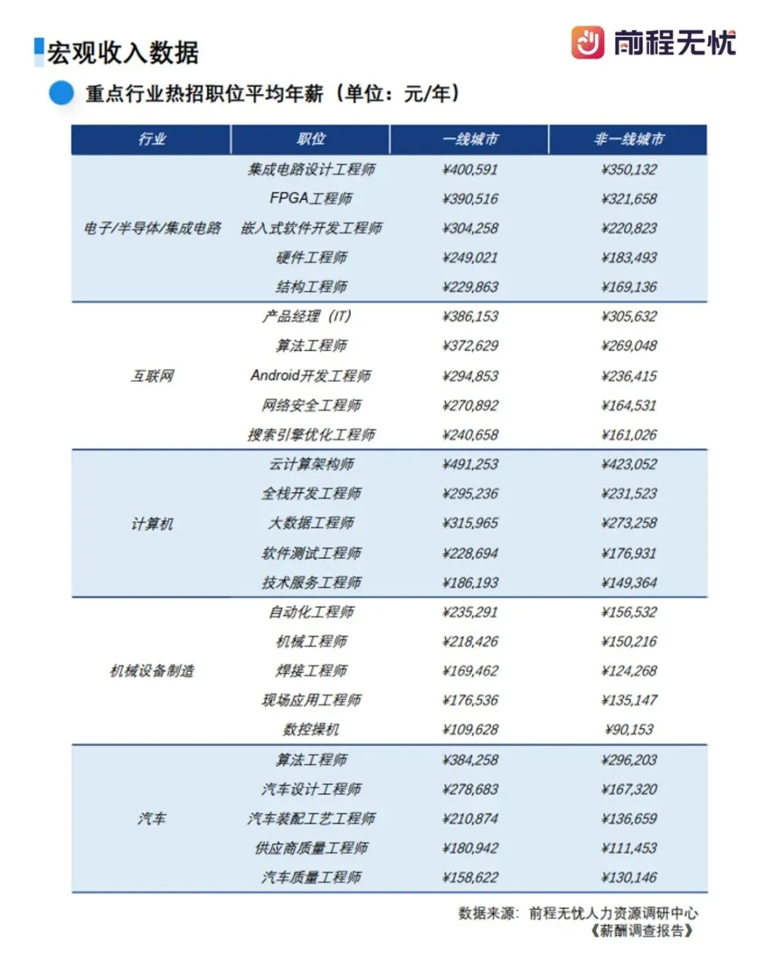 高科技行业在2025年以4.9%的调薪幅度高居各行业之首。尽管全球投融资环境有所波动,但在国家对人工智能、半导体等关键领域的政策倾斜下,该行业对核心技术人才的竞争已进入“刚需”阶段。前程无忧人力资源调研中心《薪酬调查报告》显示,集成电路设计工程师在一线城市的平均年薪高达400,591元,即使在非一线城市也维持在350,132元的高位。而云计算架构师作为数字化转型的底层支撑,一线城市的平均年薪更是接近50万元(491,253元),是目前市场上极具含金量的职位之一。在2026年,对于掌握核心算法、芯片设计等底层技术的专业人才,其薪酬溢价能力将持续增强。