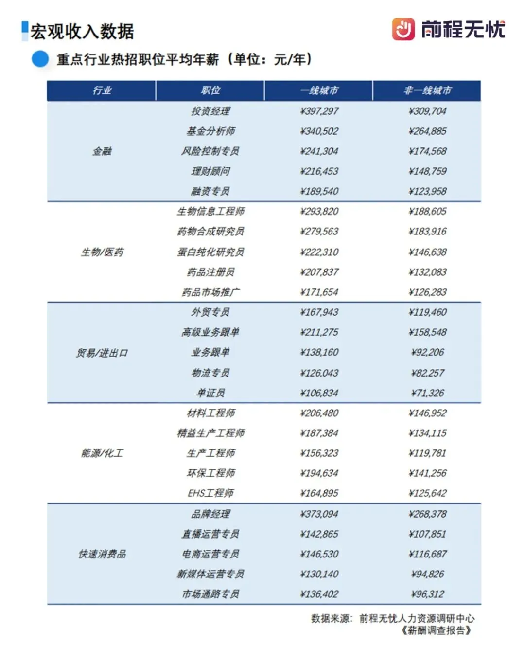 医药健康行业在2025年保持了4.4%的调薪幅度。在老龄化趋势和生物技术创新的双重驱动下,该行业展现出极强的抗周期属性。作为行业核心岗位同时也是跨学科职位的代表,生物信息工程师在一线城市的年薪可达293,820元,但在非一线城市仅为188,605元,这显示出顶尖生物医药资源高度向一线城市集中的态势。而药物合成研究员在一线城市平均年薪也达到了279,563元,体现了行业对创新药研发能力的持续投入。对于从业者而言,从较高的调薪幅度可以看出,生物医药赛道具备较强的长期确定性,是薪酬稳健增长的优选路径。