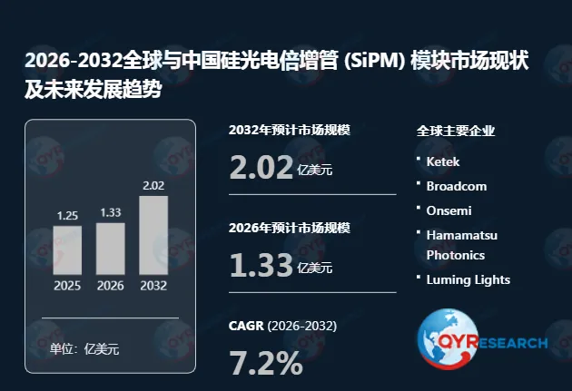 根据QYR(恒州博智)的统计及预测,2025年全球硅光电倍增管 (SiPM) 模块市场销售额达到了1.25亿美元,预计2032年将达到2.02亿美元,年复合增长率(CAGR)为7.2%(2026-2032)。
