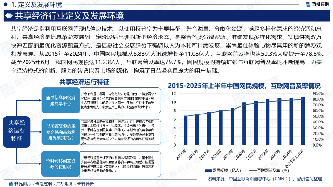 发展环境:中国庞大的人口基数与超大体量的网民群体,不仅为共享经济提供了广阔的市场想象空间,更成为驱动其高速发展的强劲引擎。从2015年至2024年,中国网民规模从6.88亿人迅速增长至11.08亿人,互联网普及率也从50.3%大幅提升至78.6%。截至2025年6月,我国网民规模达11.23亿人,互联网普及率达79.7%。网民规模的持续扩张与互联网普及率的不断提高,为共享经济模式的创新、服务的渗透以及市场的深化,构筑了日益坚实且庞大的用户基础。