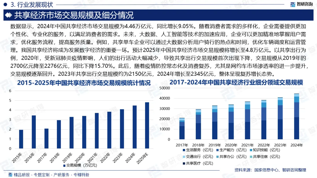 共享经济是指利用互联网等现代信息技术,以使用权分享为主要特征,整合海量、分散化资源,满足多样化需求的经济活动总和。共享经济是信息革命发展到一定阶段后出现的新型经济形态,是整合各类分散资源、准确发现多样化需求、实现供需双方快速匹配的最优化资源配置方式,是信息社会发展趋势下强调以人为本和可持续发展、崇尚最佳体验与物尽其用的新的消费观和发展观。作为一种创新的经济模式,共享经济在提高资源利用效率、促进经济发展和增加就业机会等方面发挥了重要作用。在交通出行领域,共享单车、共享汽车等模式得到了广泛应用,这些模式的出现不仅方便了人们的出行,也有效缓解了城市交通拥堵和环境污染问题。在生活服务领域,共享经济也展现出巨大的市场潜力。例如,共享厨房、共享住宿、共享办公空间等模式逐渐兴起,这些模式的出现不仅为人们提供了更加便捷的生活服务,也为创业者和小微企业提供了灵活的运营方式。数据显示,2024年中国共享经济市场交易规模为4.46万亿元,同比增长9.05%。随着消费者需求的多样化,企业需要提供更加个性化、专业化的服务,以满足消费者的需求。未来,大数据、人工智能等技术的加速应用,企业可以更加精准地掌握用户需求,优化服务流程,提高服务质量。例如,共享单车企业可以通过大数据分析用户骑行的热点和时间,优化车辆调度和运营管理。我国共享经济将成为发展数字经济的重要一环。预计2025年中国共享经济市场交易规模将增长至4.8万亿元。中国共享经济各细分领域已形成由代表性平台主导的活跃生态。在交通出行领域,滴滴出行、曹操出行、哈啰出行等平台覆盖多元需求;共享住宿由美团民宿、途家等提供主要服务;共享充电宝市场则由怪兽充电、街电等品牌竞争。在知识技能共享方面,知乎、猪八戒网是重要平台;共享办公以优客工场等为代表;共享医疗领域则有平安好医生、微医集团等主要服务商。这些平台共同构成了覆盖生活多方面的共享服务网络。