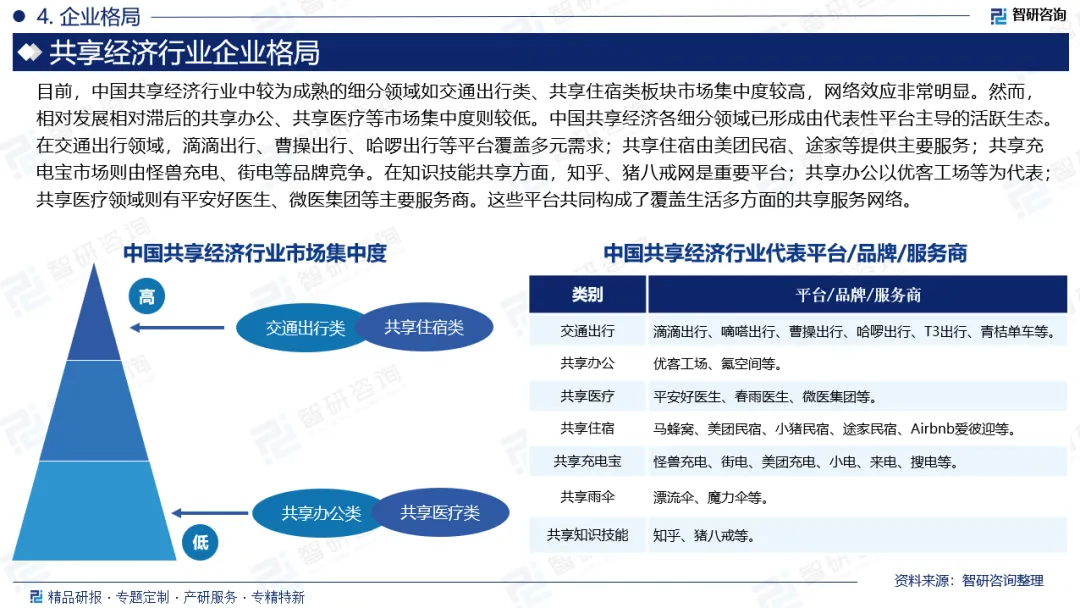 企业格局:目前,中国共享经济行业中较为成熟的细分领域如交通出行类、共享住宿类板块市场集中度较高,网络效应非常明显,即用户越多,平台的价值越大,因此,大型企业可以利用自身的优势吸引更多用户,从而进一步扩大市场份额,市场被少数几家大企业所控制。然而,相对发展相对滞后的共享办公、共享医疗等市场集中度则较低,其中共享办公的代表性企业有境外企业优客工场、氪空间等。中国共享经济各细分领域已形成由代表性平台主导的活跃生态。在交通出行领域,滴滴出行、曹操出行、哈啰出行等平台覆盖多元需求;共享住宿由美团民宿、途家等提供主要服务;共享充电宝市场则由怪兽充电、街电等品牌竞争。在知识技能共享方面,知乎、猪八戒网是重要平台;共享办公以优客工场等为代表;共享医疗领域则有平安好医生、微医集团等主要服务商。这些平台共同构成了覆盖生活多方面的共享服务网络。