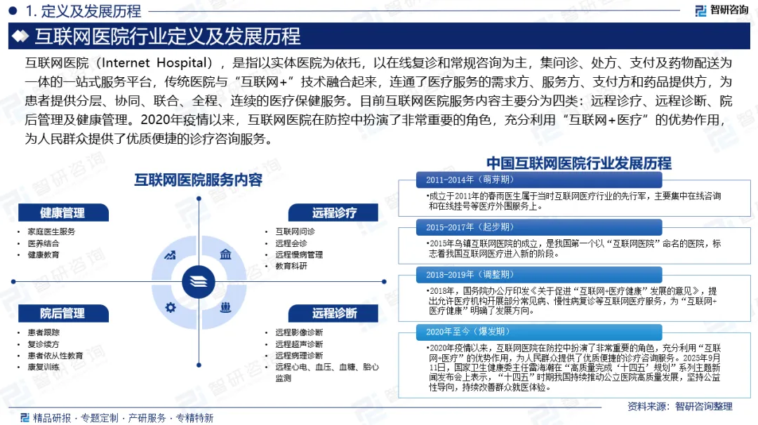 互联网医院(Internet Hospital),是指以实体医院为依托,以在线复诊和常规咨询为主,集问诊、处方、支付及药物配送为一体的一站式服务平台,传统医院与“互联网+”技术融合起来,连通了医疗服务的需求方、服务方、支付方和药品提供方,为患者提供分层、协同、联合、全程、连续的医疗保健服务。目前互联网医院服务内容主要分为四类:远程诊疗、远程诊断、院后管理及健康管理。互联网医院是“互联网+医疗”衍生的新业态,是远程医疗与传统实体医院的延伸,其以实体医院的医疗资源为基础,以互联网技术为依托,为患者提供一系列从线上到线下、前端到后端的“闭环式”医疗服务,让患者更便捷地获取与实体医院同质的医疗服务;同时,从宏观角度优化匹配现有的医疗卫生资源。互联网医院的出现打破传统就医模式,是中国医疗卫生服务体系中的新模式,成为解决群众看病难、推动医院转型发展、创新诊疗服务模式和提升智慧服务能力的重要手段。2020年我国新冠肺炎疫情爆发期间,互联网医院以覆盖广、效率高、成本低、跨地域等优势,通过线上服务疏解线下服务压力,起到分流患者的作用,成为疫情防控的技术突破口,使得全国范围内掀起互联网医院建设热潮。2020年我国互联网医院新增数量超500家。截至2022年10月,全国设置超过2700家互联网医院,开展互联网诊疗服务超过2590万人次。截至2024年底,我国互联网医院数量达3340所,每年提供互联网诊疗服务量超1亿诊疗人次。截至2025年9月,全国互联网医院已达到3756家,去年诊疗人次高达1.3亿。互联网医院的出现为人们提供了更加便捷、高效的医疗服务方式。随着互联网技术的不断发展和完善,互联网医院将在未来发挥更加重要的作用,为人们的健康保驾护航。近年来,随着国家政策对“互联网+医疗健康”的持续推动和互联网技术的广泛应用,互联网医院行业迎来了快速发展期。市场上涌现出了一批优秀的互联网医院品牌,这些品牌凭借先进的技术和优质的服务,在市场上占据了重要的地位。竞争格局主要集中在在线问诊、远程医疗等核心服务领域,各家机构纷纷通过技术创新、服务升级、合作联盟等方式提升自身竞争力。目前,互联网医院品牌主要包括平安健康、好大夫在线、京东健康、微医、春雨医生、妙手医生、阿里健康、医联、未来医生、39健康网等。