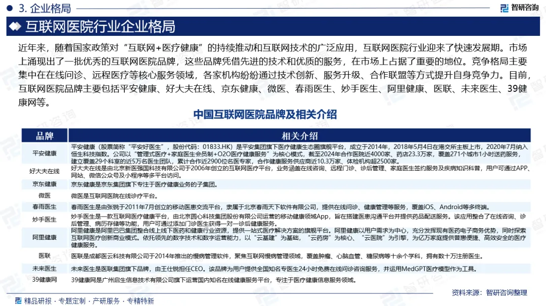 企业格局:近年来,随着国家政策对“互联网+医疗健康”的持续推动和互联网技术的广泛应用,互联网医院行业迎来了快速发展期。市场上涌现出了一批优秀的互联网医院品牌,这些品牌凭借先进的技术和优质的服务,在市场上占据了重要的地位。竞争格局主要集中在在线问诊、远程医疗等核心服务领域,各家机构纷纷通过技术创新、服务升级、合作联盟等方式提升自身竞争力。目前,互联网医院品牌主要包括平安健康、好大夫在线、京东健康、微医、春雨医生、妙手医生、阿里健康、医联、未来医生、39健康网等。